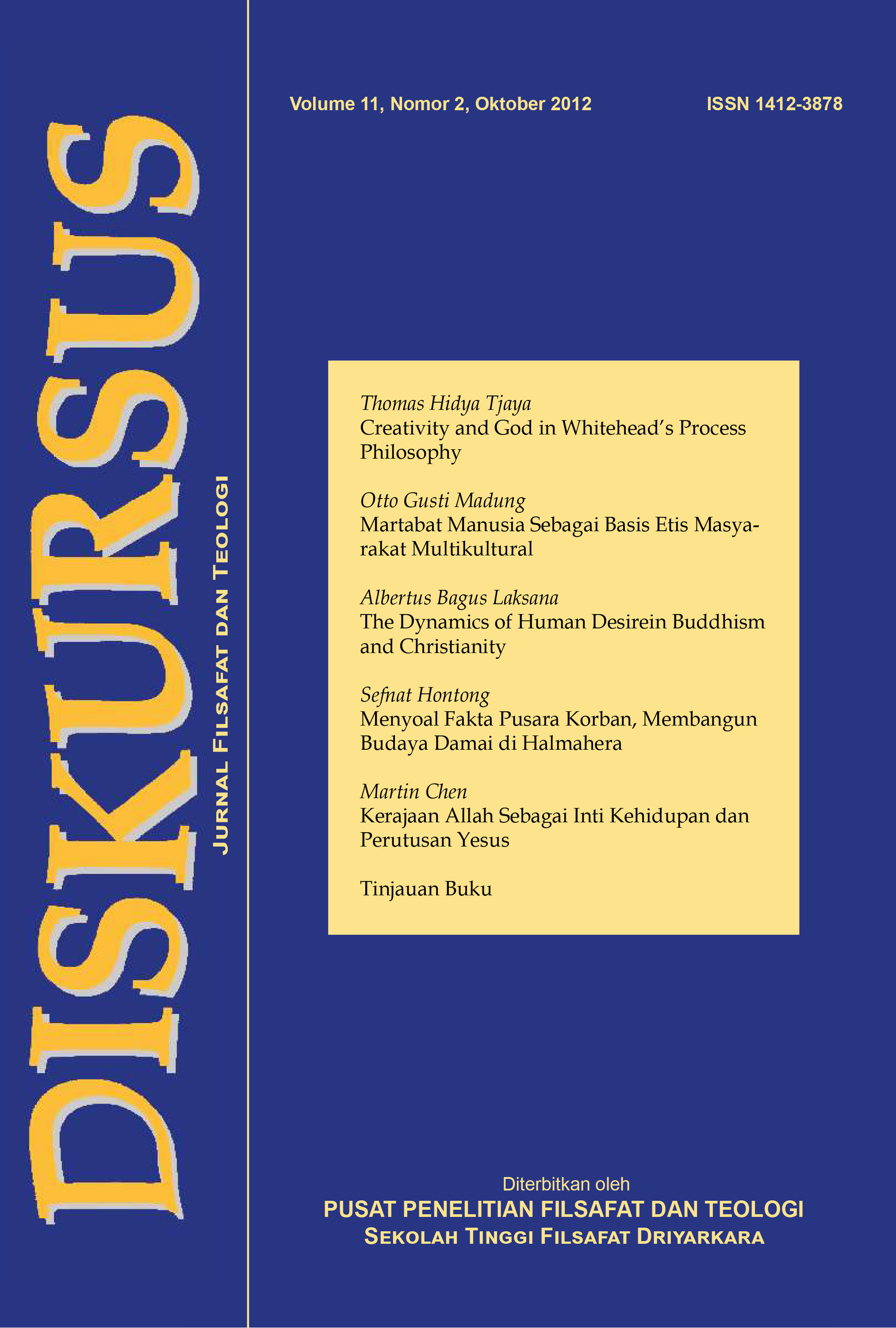 Vol. 11 No. 2 (2012)DISKURSUS (ISSN 1412-3878; e-ISSN 2580-1686) is an academic journal that publishes original and peer-reviewed works in the areas of philosophy and theology. It also welcomes works resulting from interdisciplinary research at the intersections between philosophy/theology and other disciplines, notably exegesis, linguistics, history, sociology, anthropology, politics, economics, and natural sciences. DISKURSUS aims to disseminate novel philosophical and theological ideas to scholars in the same fields, as well as to the wider public.