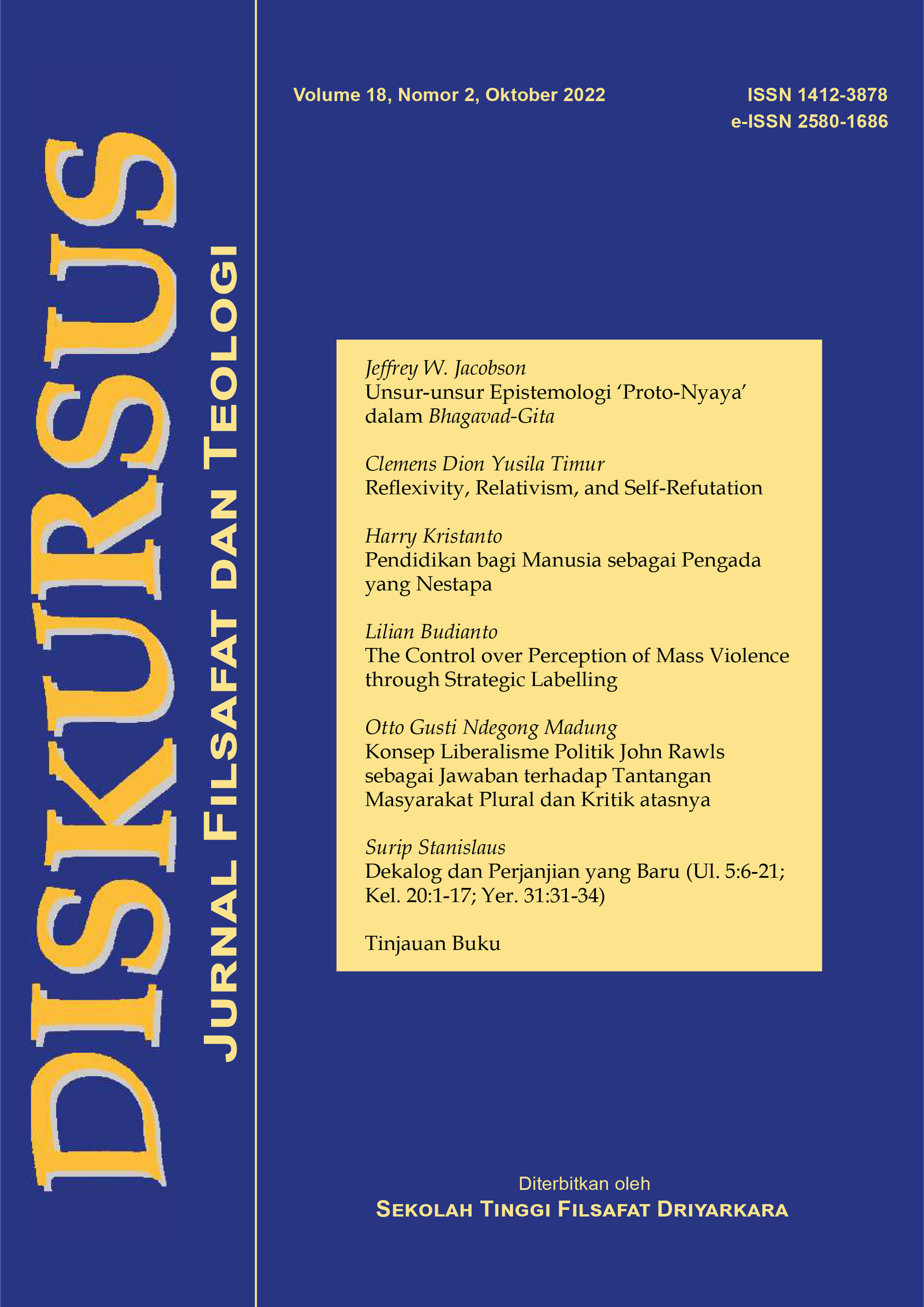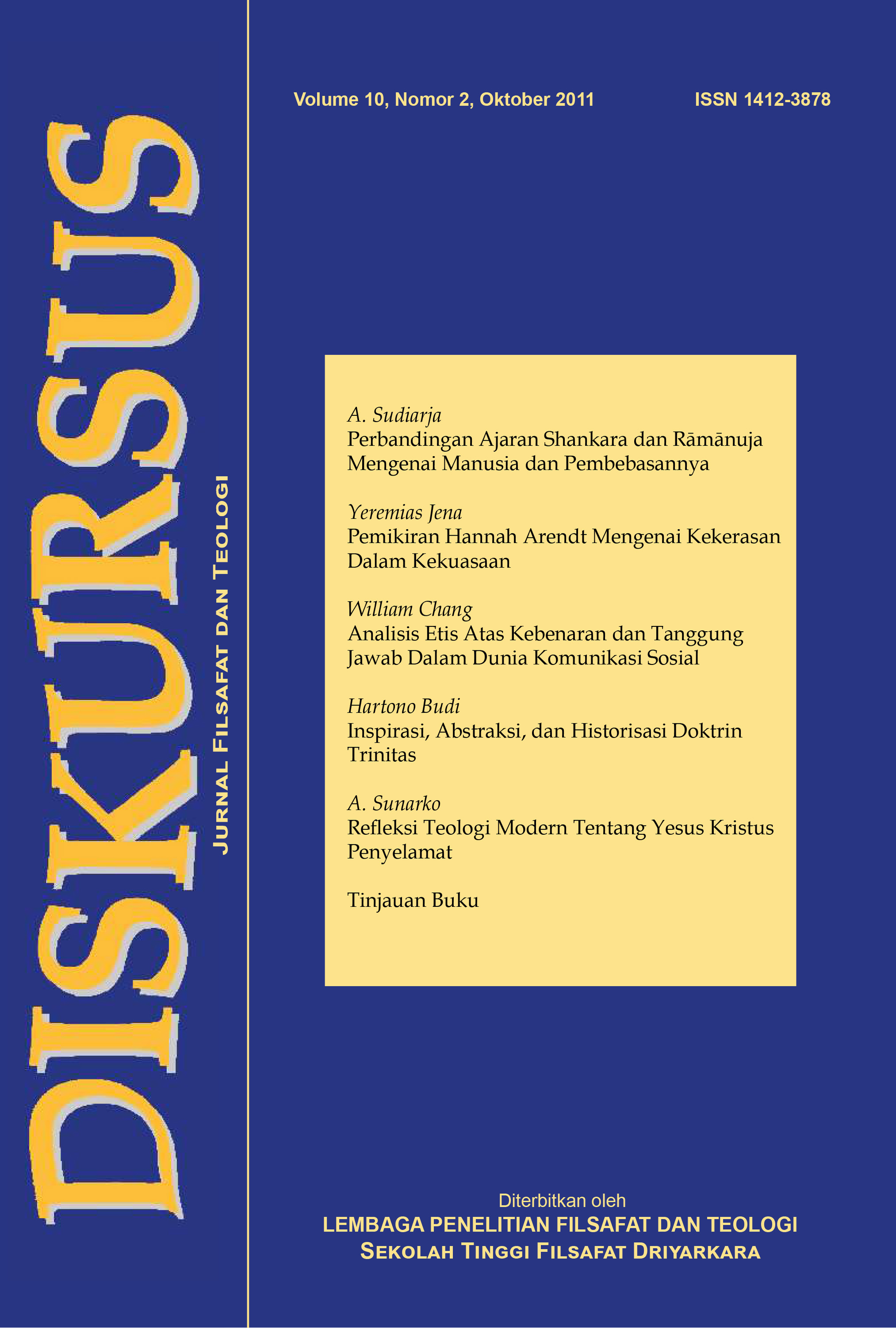 Vol. 10 No. 2 (2011)DISKURSUS (ISSN 1412-3878; e-ISSN 2580-1686) is an academic journal that publishes original and peer-reviewed works in the areas of philosophy and theology. It also welcomes works resulting from interdisciplinary research at the intersections between philosophy/theology and other disciplines, notably exegesis, linguistics, history, sociology, anthropology, politics, economics, and natural sciences. DISKURSUS aims to disseminate novel philosophical and theological ideas to scholars in the same fields, as well as to the wider public.