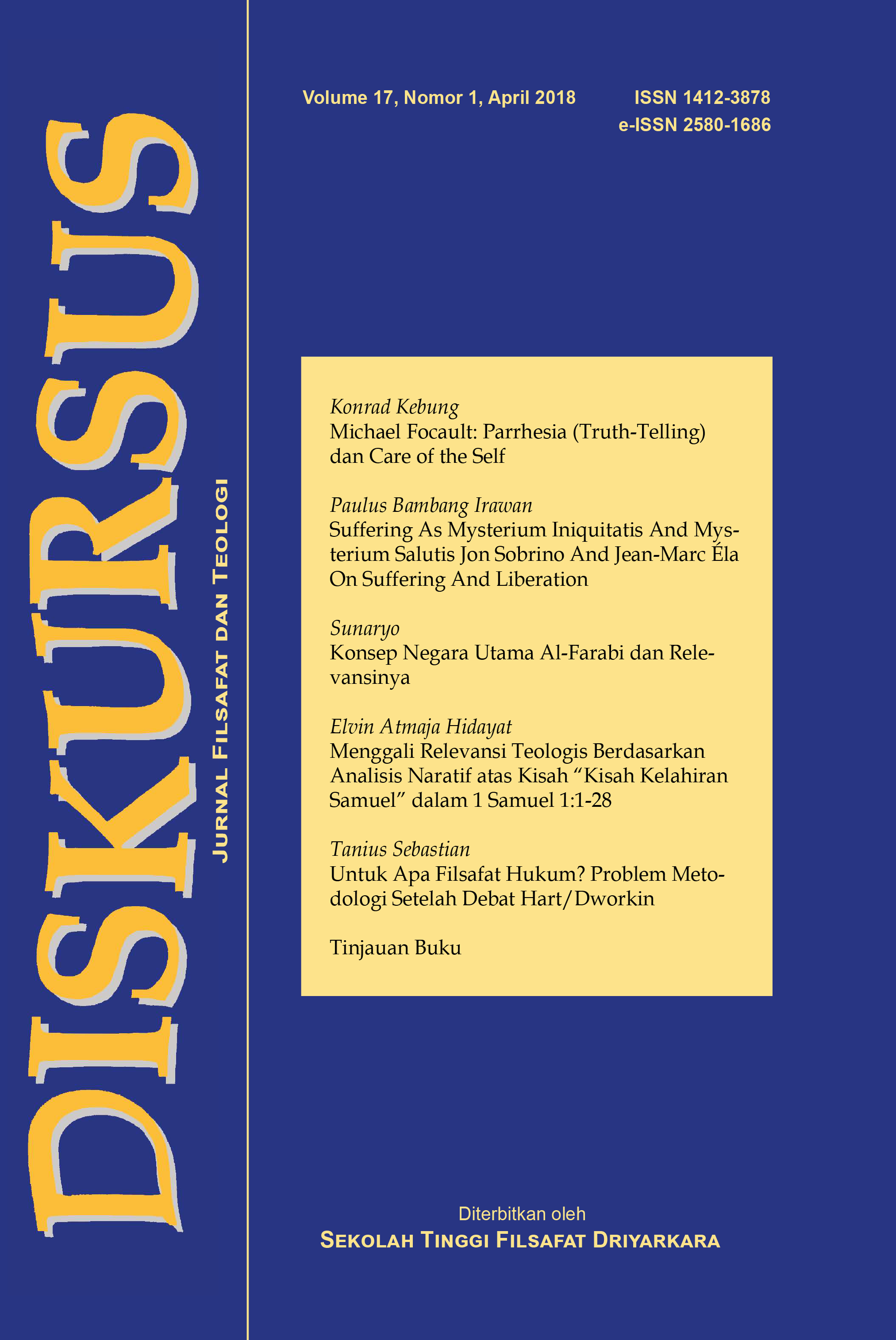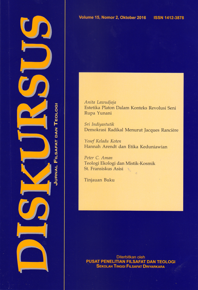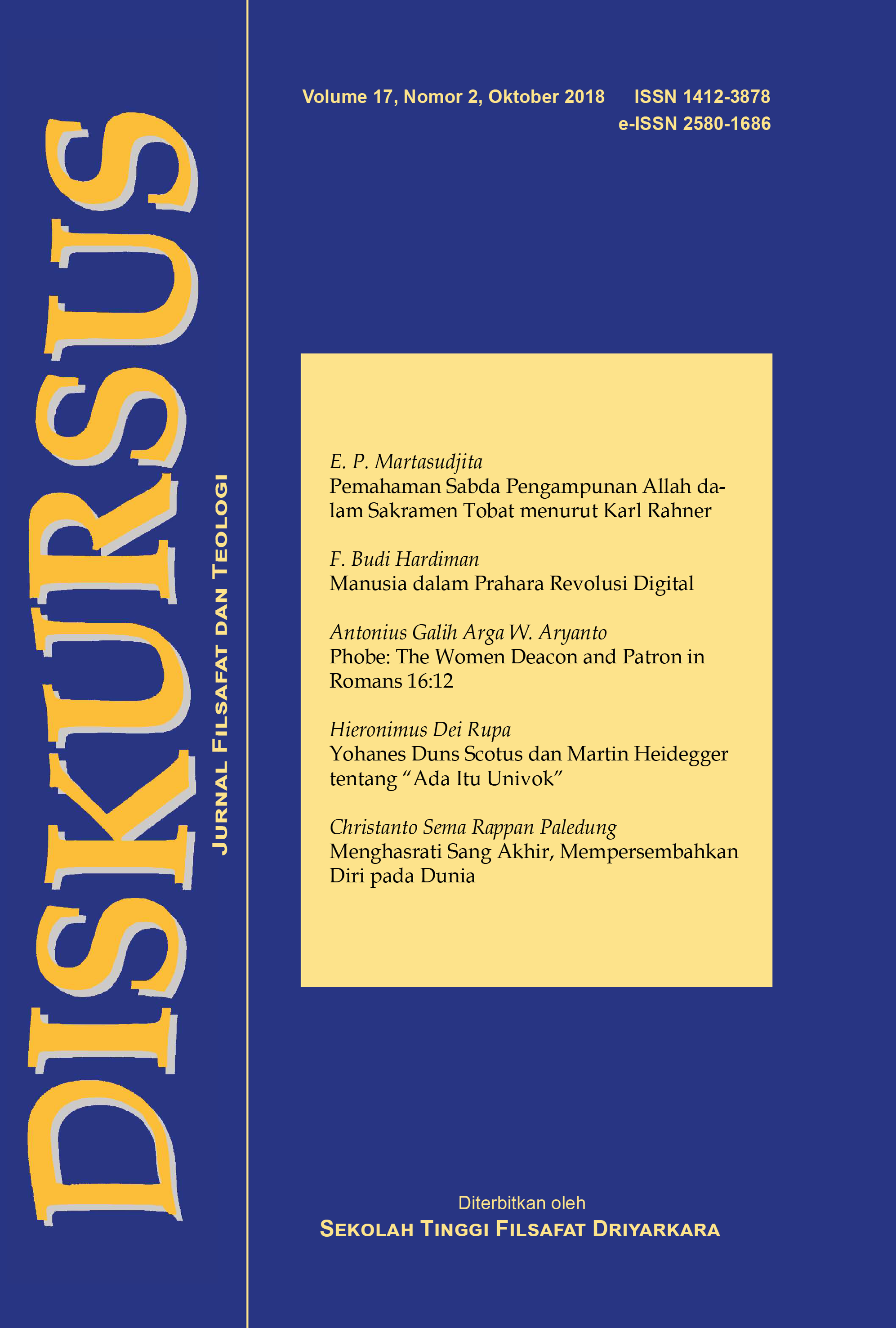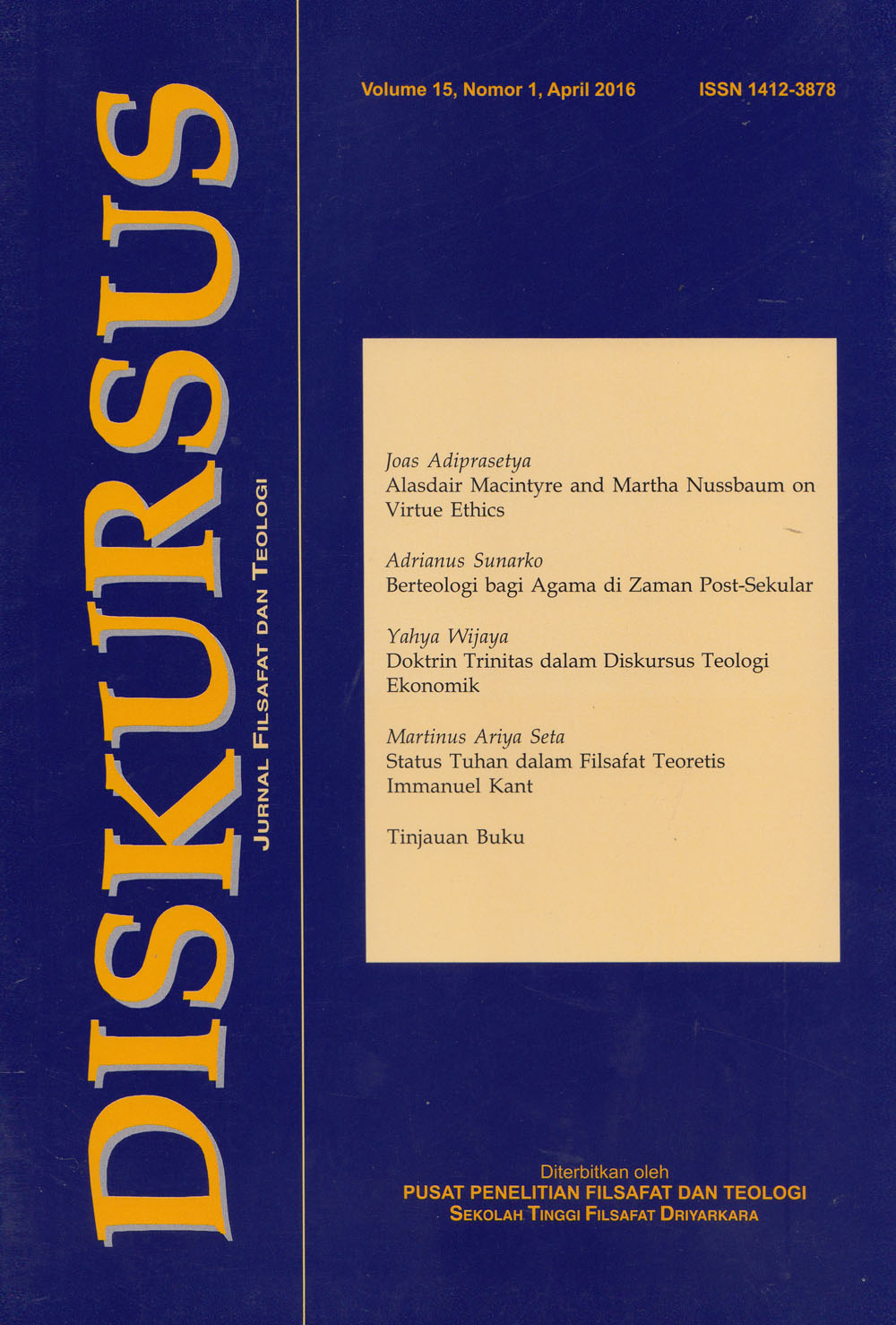 Vol. 15 No. 2 (2016)DISKURSUS (ISSN 1412-3878; e-ISSN 2580-1686) is an academic journal that publishes original and peer-reviewed works in the areas of philosophy and theology. It also welcomes works resulting from interdisciplinary research at the intersections between philosophy/theology and other disciplines, notably exegesis, linguistics, history, sociology, anthropology, politics, economics, and natural sciences. DISKURSUS aims to disseminate novel philosophical and theological ideas to scholars in the same fields, as well as to the wider public.