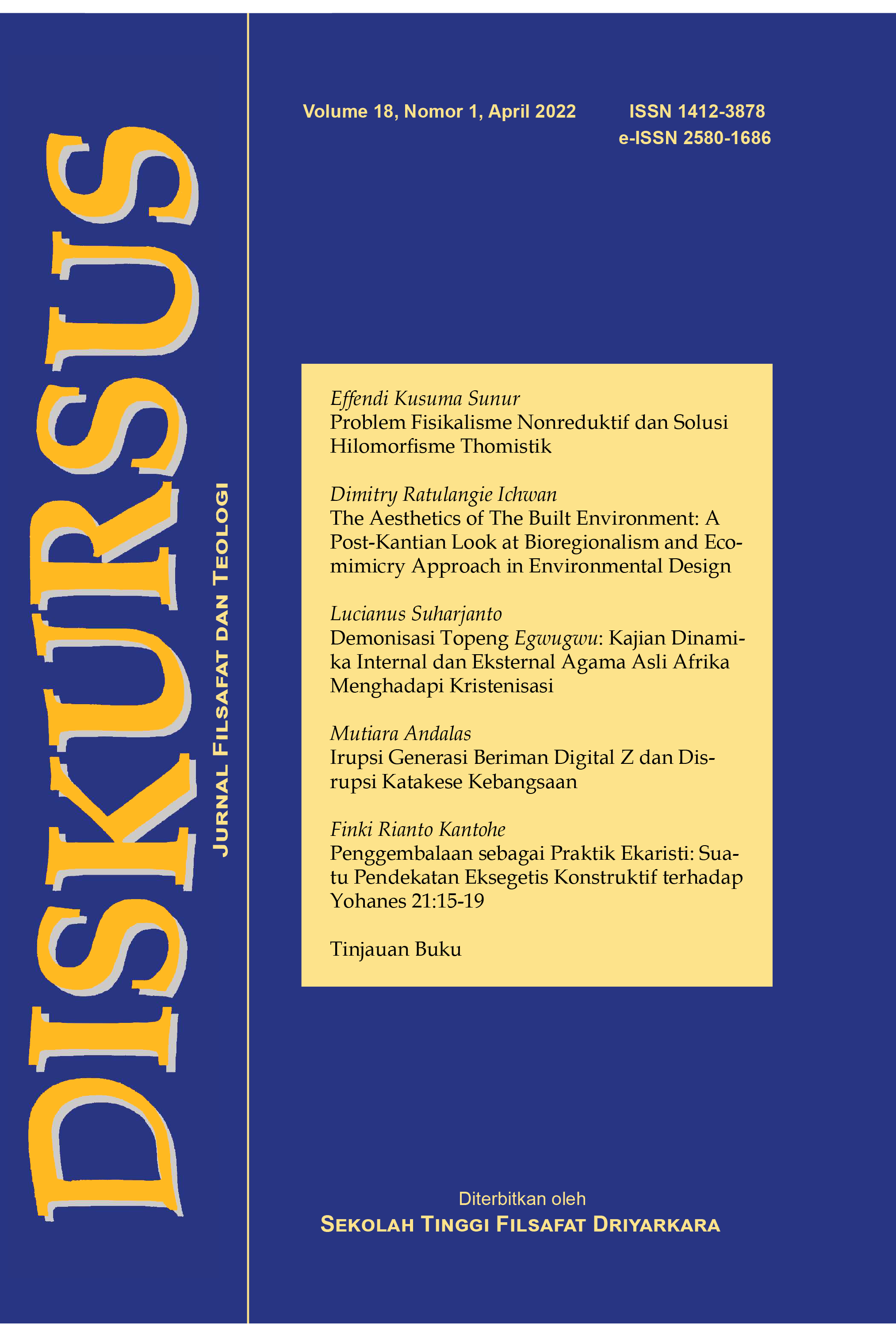 Vol. 18 No. 1 (2022)DISKURSUS (ISSN 1412-3878; e-ISSN 2580-1686) is an academic journal that publishes original and peer-reviewed works in the areas of philosophy and theology. It also welcomes works resulting from interdisciplinary research at the intersections between philosophy/theology and other disciplines, notably exegesis, linguistics, history, sociology, anthropology, politics, economics, and natural sciences. DISKURSUS aims to disseminate novel philosophical and theological ideas to scholars in the same fields, as well as to the wider public.