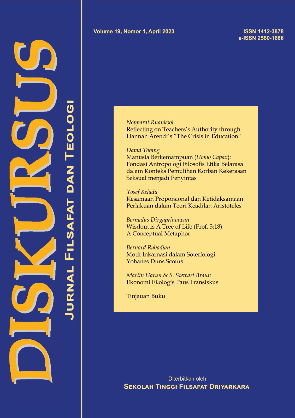 Vol. 19 No. 1 (2023)DISKURSUS (ISSN 1412-3878; e-ISSN 2580-1686) is an academic journal that publishes original and peer-reviewed works in the areas of philosophy and theology. It also welcomes works resulting from interdisciplinary research at the intersections between philosophy/theology and other disciplines, notably exegesis, linguistics, history, sociology, anthropology, politics, economics, and natural sciences. DISKURSUS aims to disseminate novel philosophical and theological ideas to scholars in the same fields, as well as to the wider public.