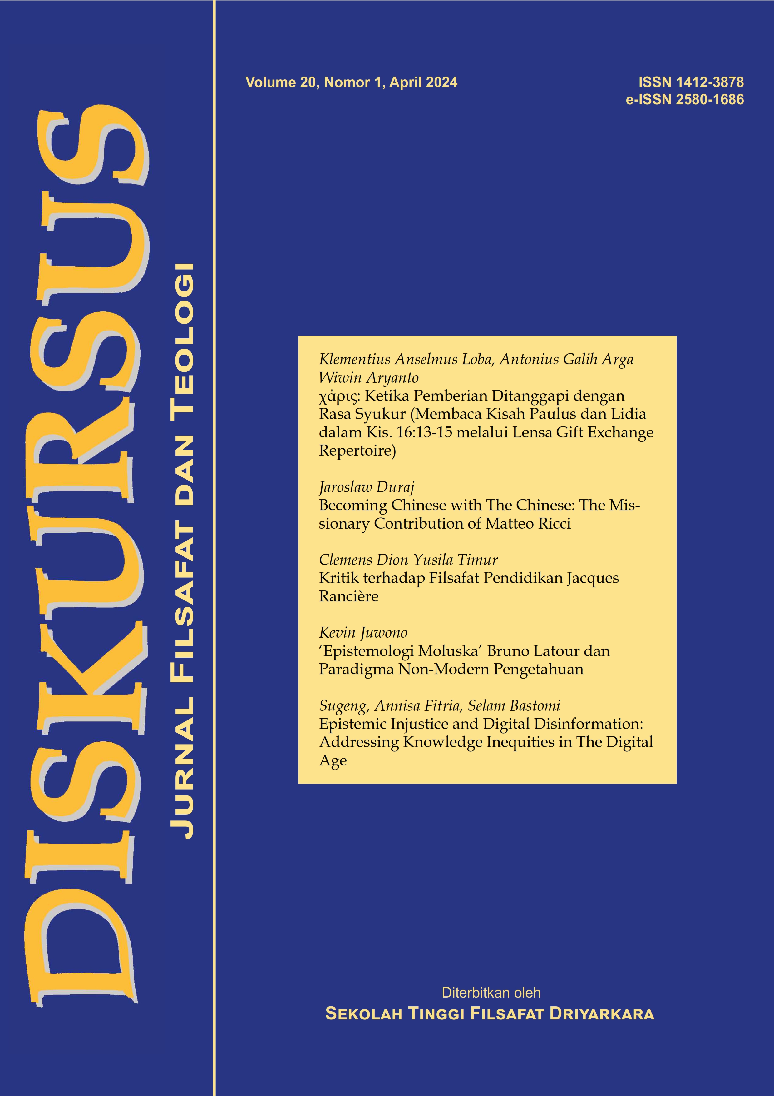 Vol. 20 No. 1 (2024)DISKURSUS (ISSN 1412-3878; e-ISSN 2580-1686) is an academic journal that publishes original and peer-reviewed works in the areas of philosophy and theology. It also welcomes works resulting from interdisciplinary research at the intersections between philosophy/theology and other disciplines, notably exegesis, linguistics, history, sociology, anthropology, politics, economics, and natural sciences. DISKURSUS aims to disseminate novel philosophical and theological ideas to scholars in the same fields, as well as to the wider public.