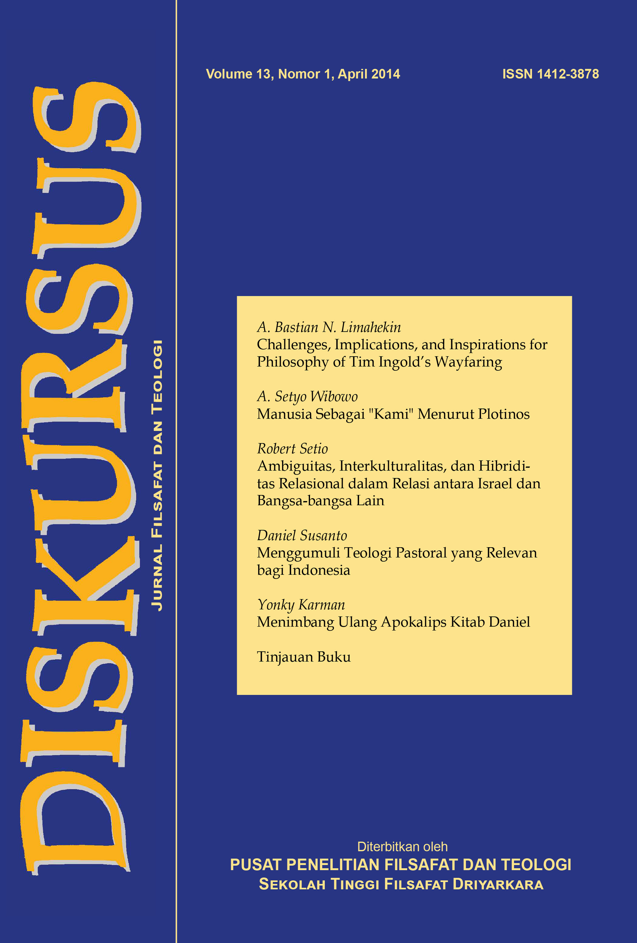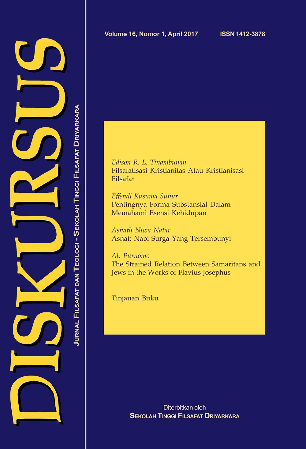 Vol. 13 No. 1 (2014)DISKURSUS (ISSN 1412-3878; e-ISSN 2580-1686) is an academic journal that publishes original and peer-reviewed works in the areas of philosophy and theology. It also welcomes works resulting from interdisciplinary research at the intersections between philosophy/theology and other disciplines, notably exegesis, linguistics, history, sociology, anthropology, politics, economics, and natural sciences. DISKURSUS aims to disseminate novel philosophical and theological ideas to scholars in the same fields, as well as to the wider public.